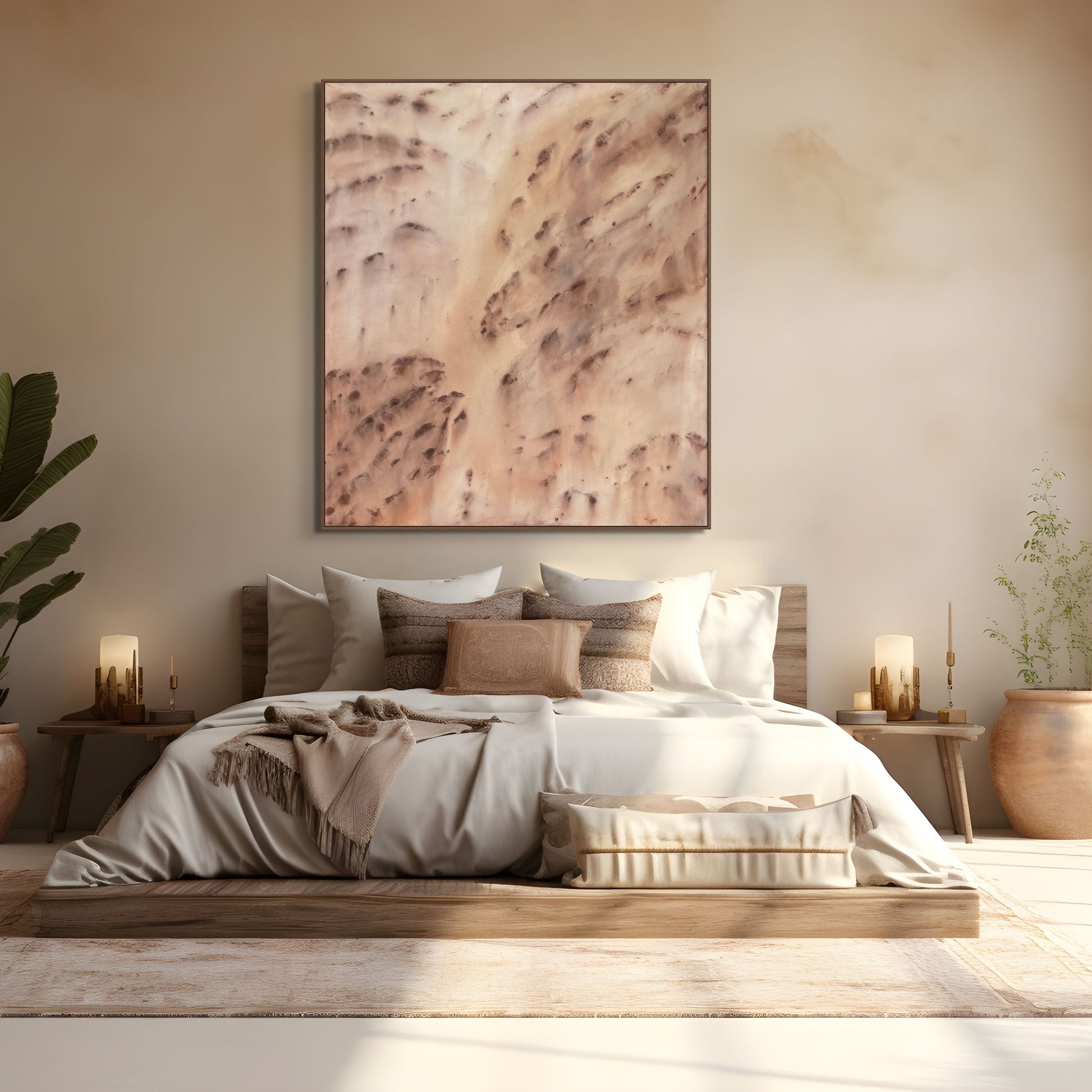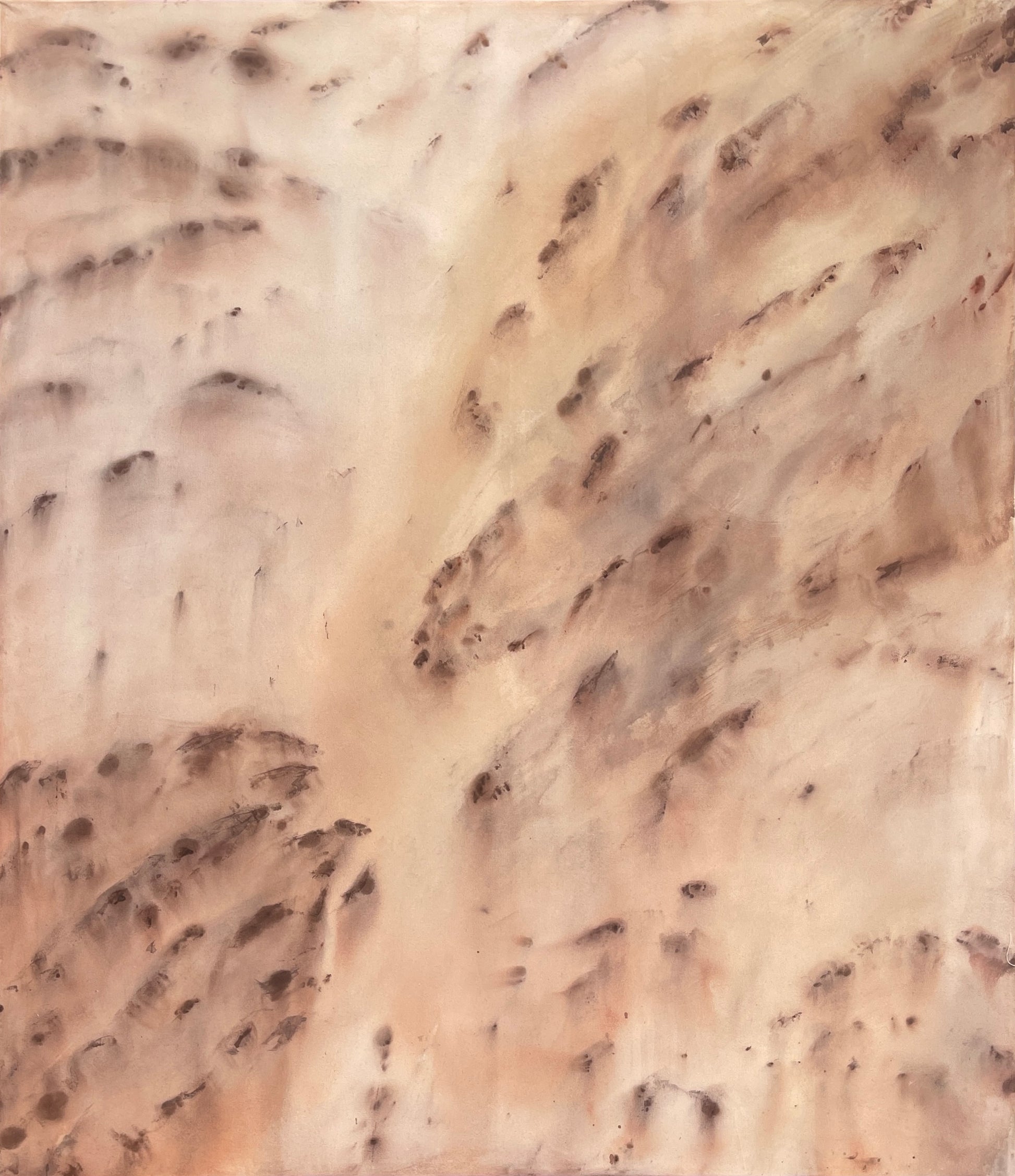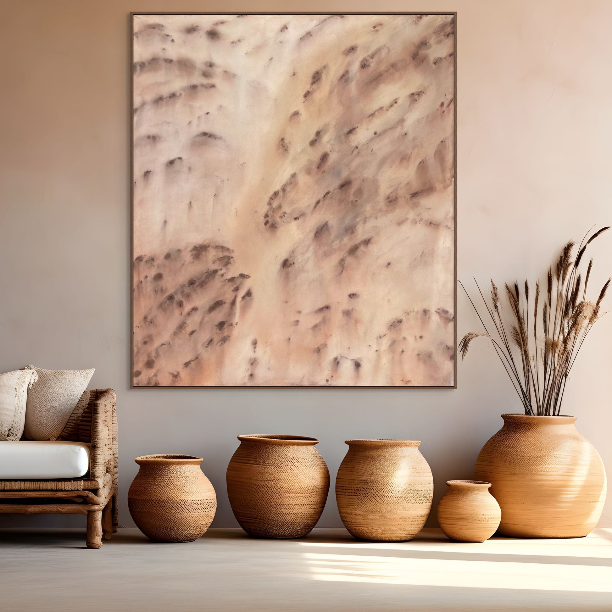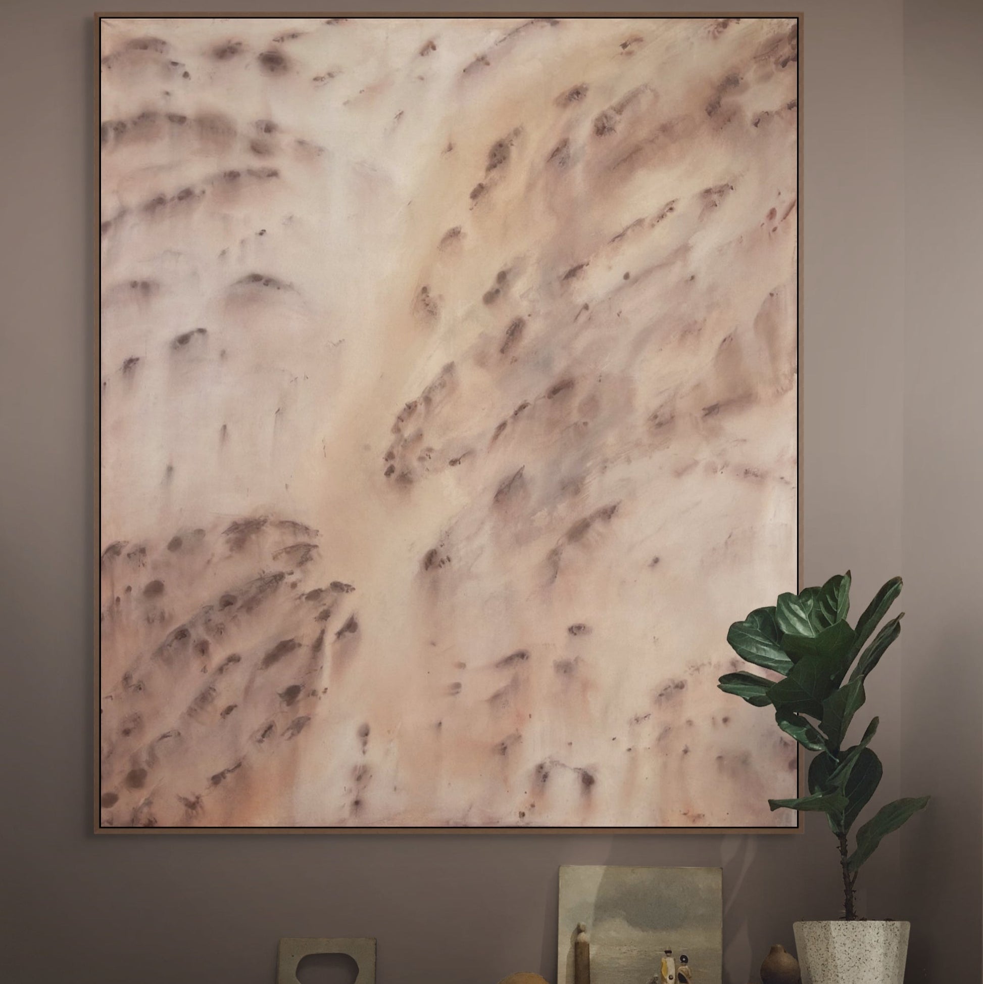 Where Two Worlds Meet is an abstract exploration of thresholds — that intangible space between what is known and what is felt. Soft, raw textures drift across the canvas like whispered echoes, where muted earth tones and delicate light collide, yet never quite settle.